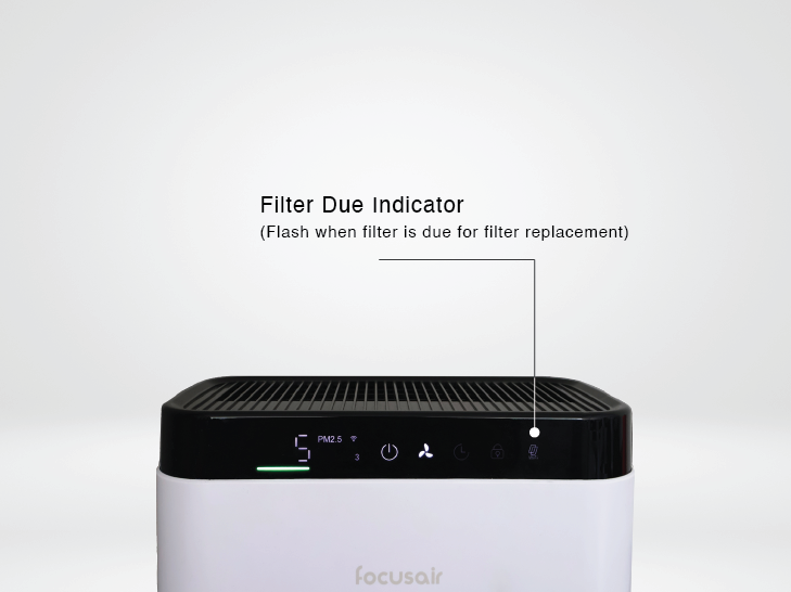 focusair purifier is equipped with a filter due indicator, which will flash at 1500 hours to prompt for filter replacement. Press and hold the reset button for 5 seconds to clear the filter indicator and reset the timing function